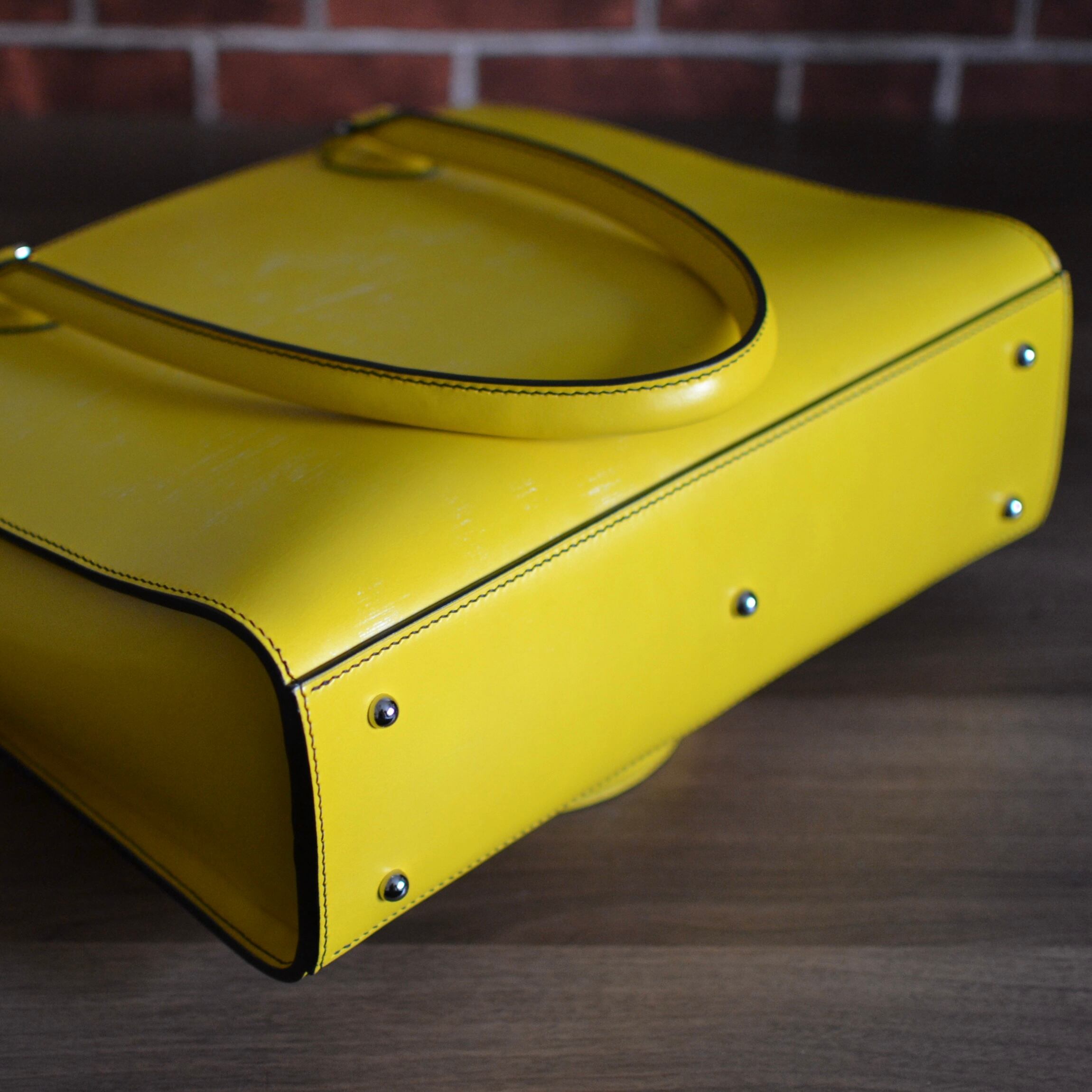 世界中で愛される高品質なブライドルレザーを使用した、鮮やかな黄色のトートバッグです。ブライドルレザーは、他の革に比べて耐久性に優れ、使い込むほどに風合いが増していきます。このトートバッグは、コーディネートのアクセントとしても抜群の存在感を放ちます。